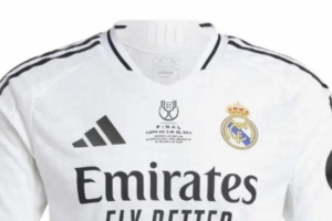 皇马将在周六对阵巴萨的国王杯决赛中穿上这款特别版球衣,球衣胸前印有国王杯决赛标志,包括比赛日期和对阵双方队名:皇家马德里、巴塞罗那。球衣袖子上也将印有国王杯决赛的徽章。
